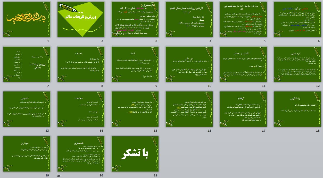 در این بخش پاورپوینت ورزش و تفریحات سالم در 21 اسلاید برای دانلود قرار داده شده است. در ذیل پیشنمایشی از آن آورده شده است.