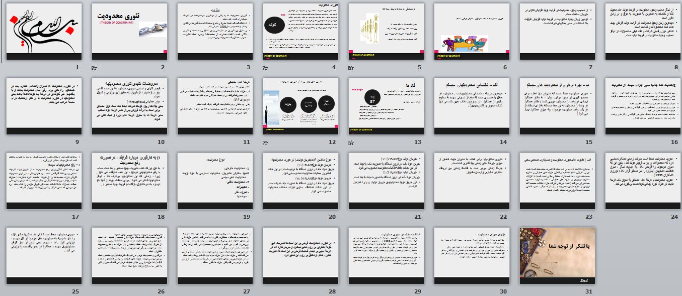 در این بخش پاورپونیت تئوری محدودیت در حسابداری در 31 اسلاید برای دانلود قرار داده شده است. در ذیل پیشنمایشی از آن آورده شده است.