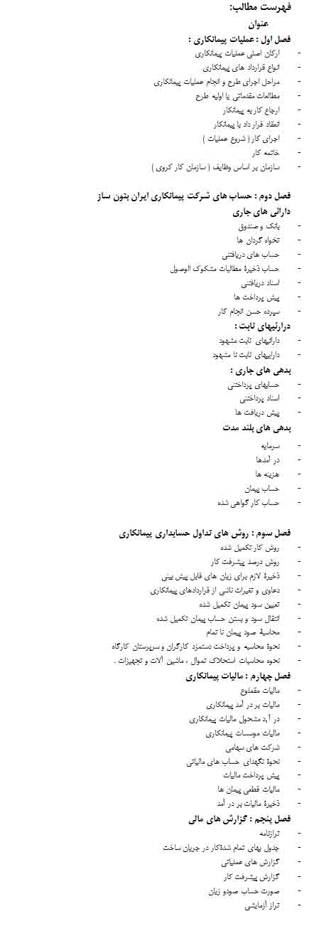 در این بخش پروژهای با موضوع و عنوان مراحل حسابداري پيمانكاري در 111 صفحه، با فرمت WORD و کاملاً فهرست و صفحهبندی شده برای دانلود قرار داده شده است. در ذیل فهرست مطالب آن آورده شده است.