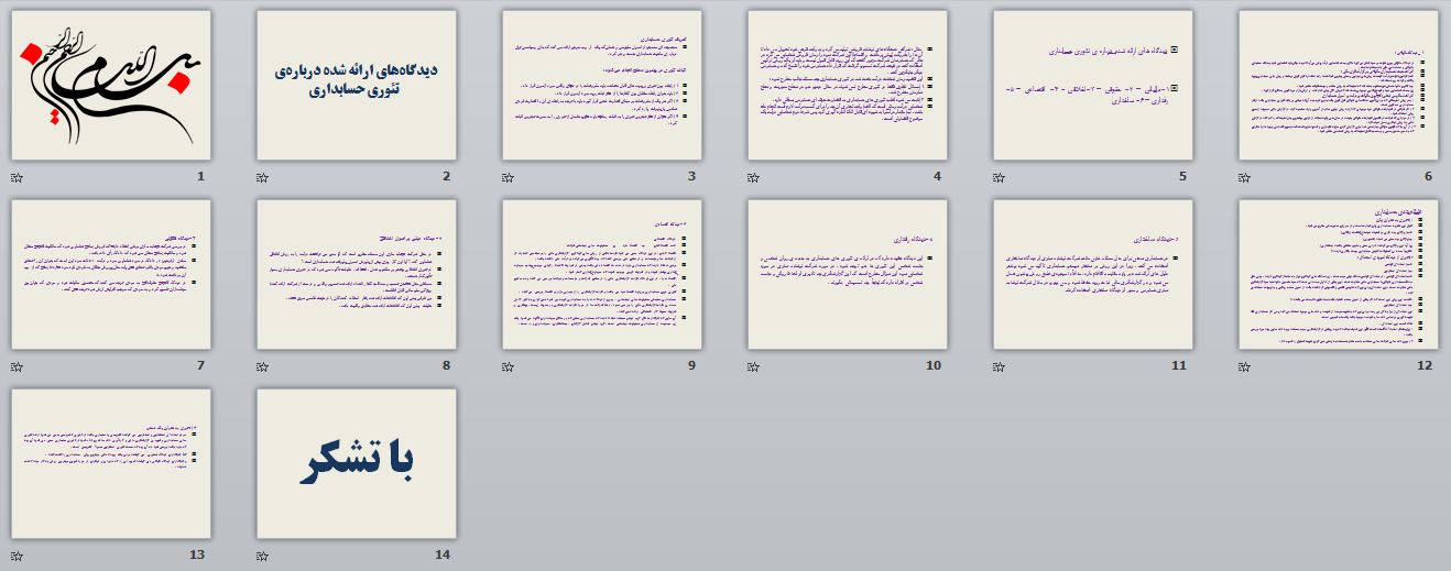 در این بخش پاورپوینت ديدگاههاي ارائه شده دربارهي تئوري حسابداري در 14 اسلاید برای دانلود قرار داده شده است. در ذیل پیشنمایشی از آن آورده شده است.
